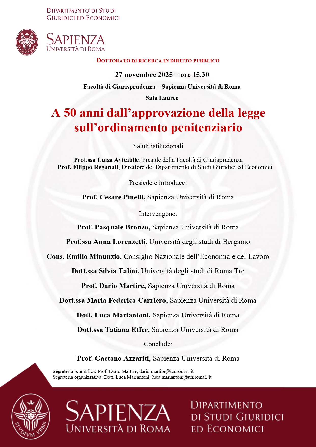 Segreteria organizzativa: Dott. Luca Mariantoni, luca.mariantoni@uniroma1.it