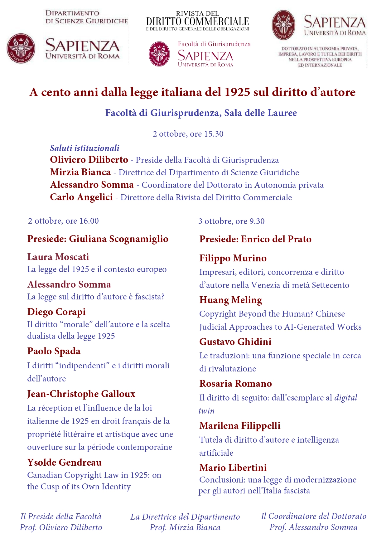 A cento anni dalla legge italiana del 1925 sul diritto d’autore 2 ottobre 2025 - ore 15:30 - Facoltà di Giurisprudenza, Sala delle Lauree
