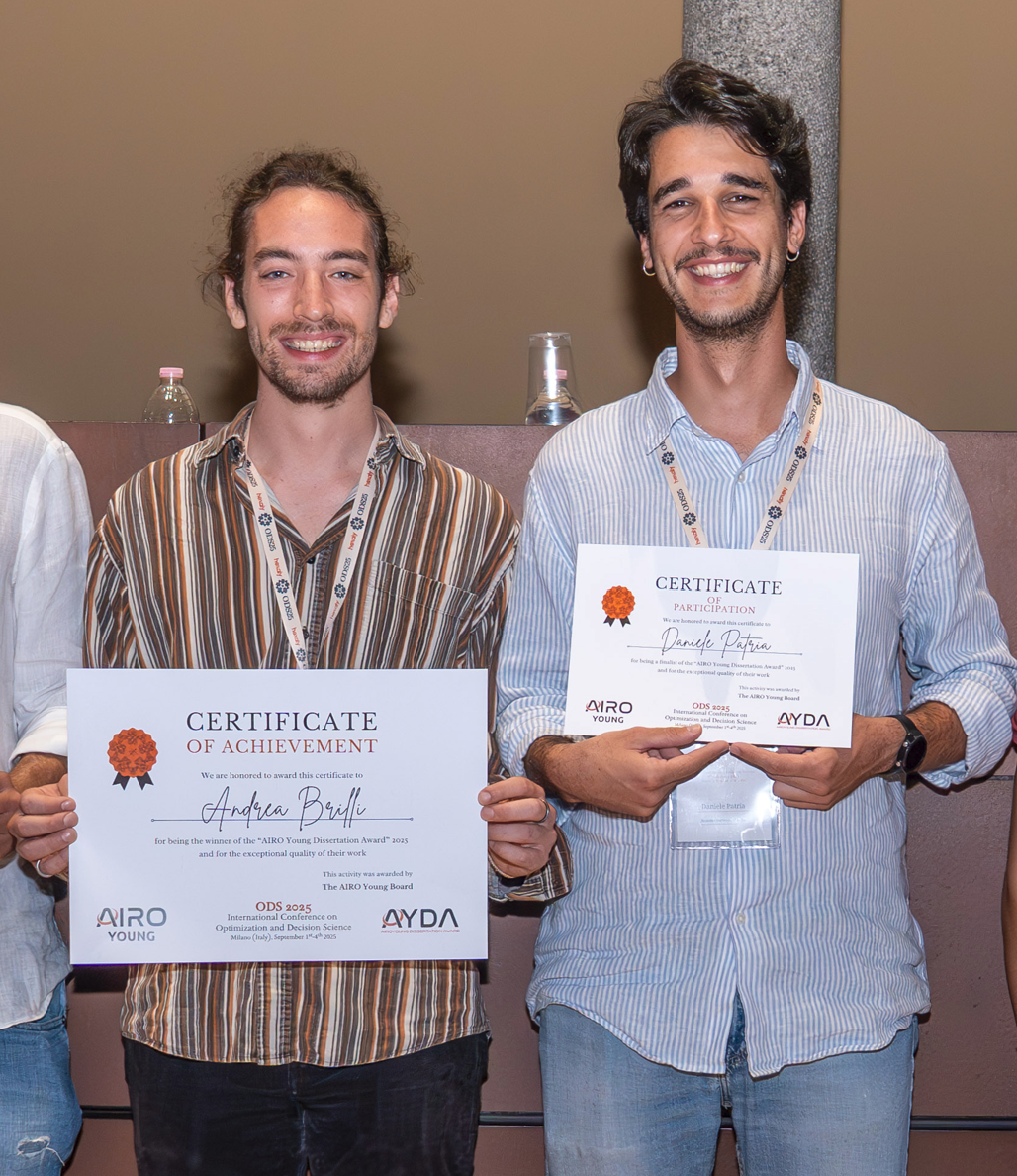 Andrea BRILLI (37th cycle - ABRO OR) won the 2025 AYDA (AIROYoung Dissertation Award) for the best doctoral thesis discussed in Operations Research at an Italian university during the period July 1, 2024 – May 31, 2025. with his thesis entitled ‘Derivative-Free Optimisation: worst-case complexity for Line-Search methods and a Mixed Penalty-Barrier approach’ (supervisor G. Liuzzi).