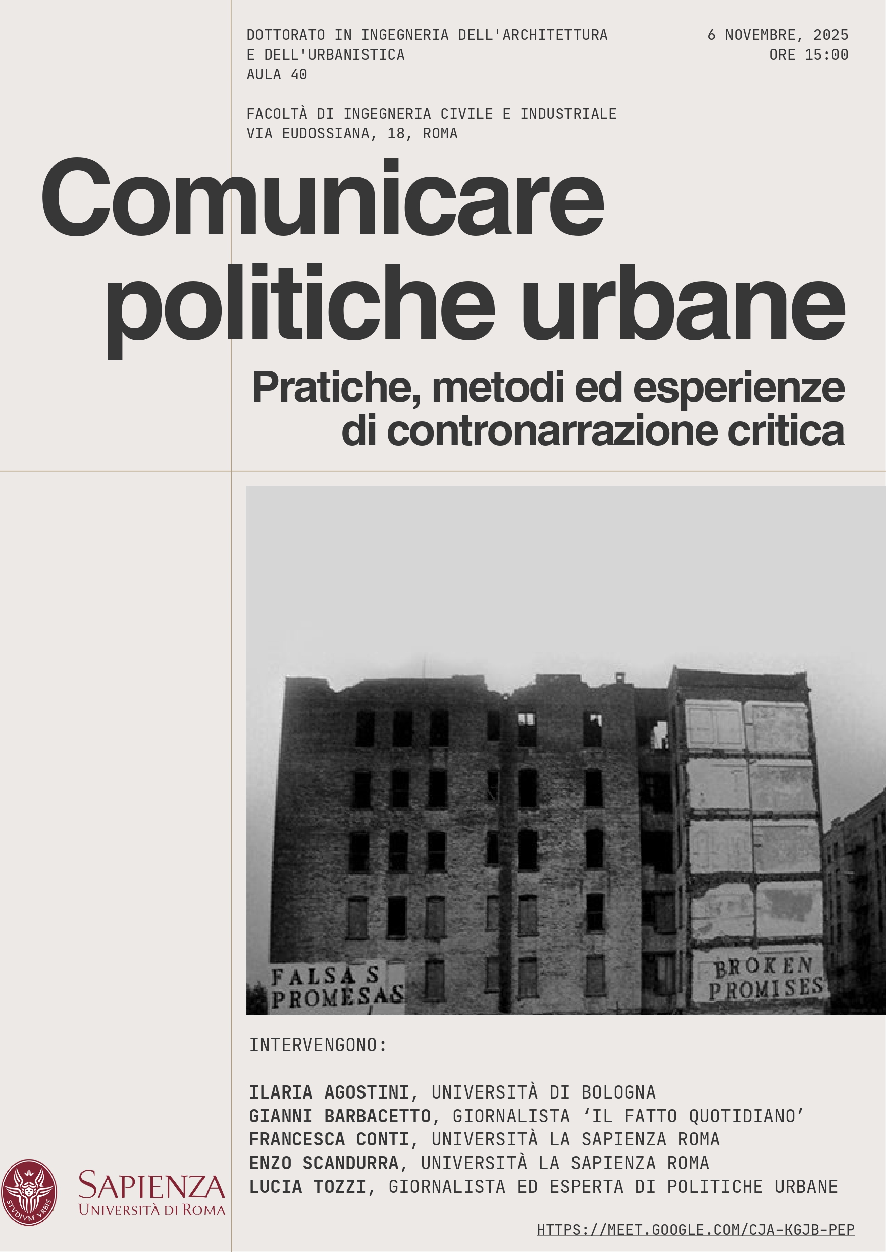 How is institutional communication on urban policy developed and deconstructed? In a scenario where the apologia of urban capitalism becomes the predominant narrative, what is the role of journalistic, independent and 'scientific'; counter-narratives? Are the tools and strategies they use effective in providing a convincingrepresentation of urban phenomena and proposing scenarios of desirable worlds? Or, on the contrary, is it necessary to find new modes of communication and new synergies between communicators (professionals, activists, researchers)?