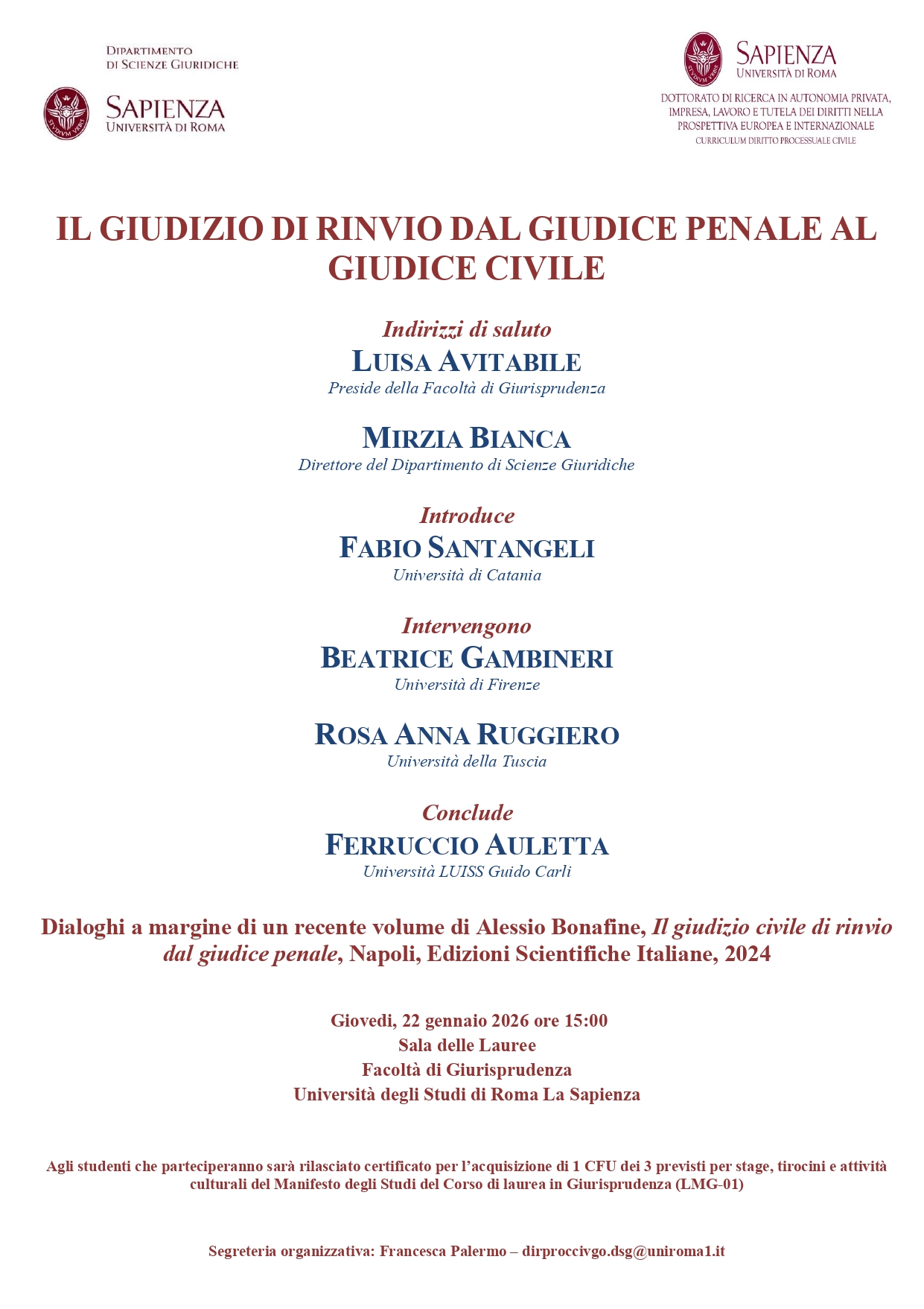 Il giudizio di rinvio dal Giudice penale al Giudice civile 22 gennaio 2026 ore 15:00 Sala delle Lauree Facoltà di Giurisprudenza Università degli Studi di Roma La Sapienza Locandina