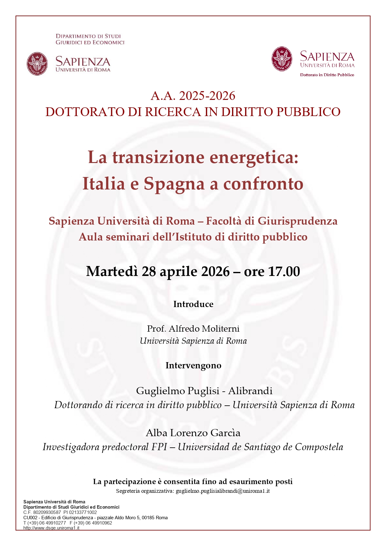 La transizione energetica: Italia e Spagna a confronto Martedì 28 aprile 2026, ore 17:00, Aula Seminari dell’Istituto di Diritto Pubblico 28/04/2026 La transizione energetica: Italia e Spagna a confronto Introduce Prof. Alfredo Moliterni Università Sapienza di Roma Intervengono Guglielmo Puglisi - Alibrandi Dottorando di ricerca in diritto pubblico – Università Sapienza di Roma Alba Lorenzo Garcìa Investigadora predoctoral FPI – Universidad de Santiago de Compostela La partecipazione è consentita fino ad esaurimento posti Segreteria organizzativa: guglielmo.puglisialibrandi@uniroma1.it