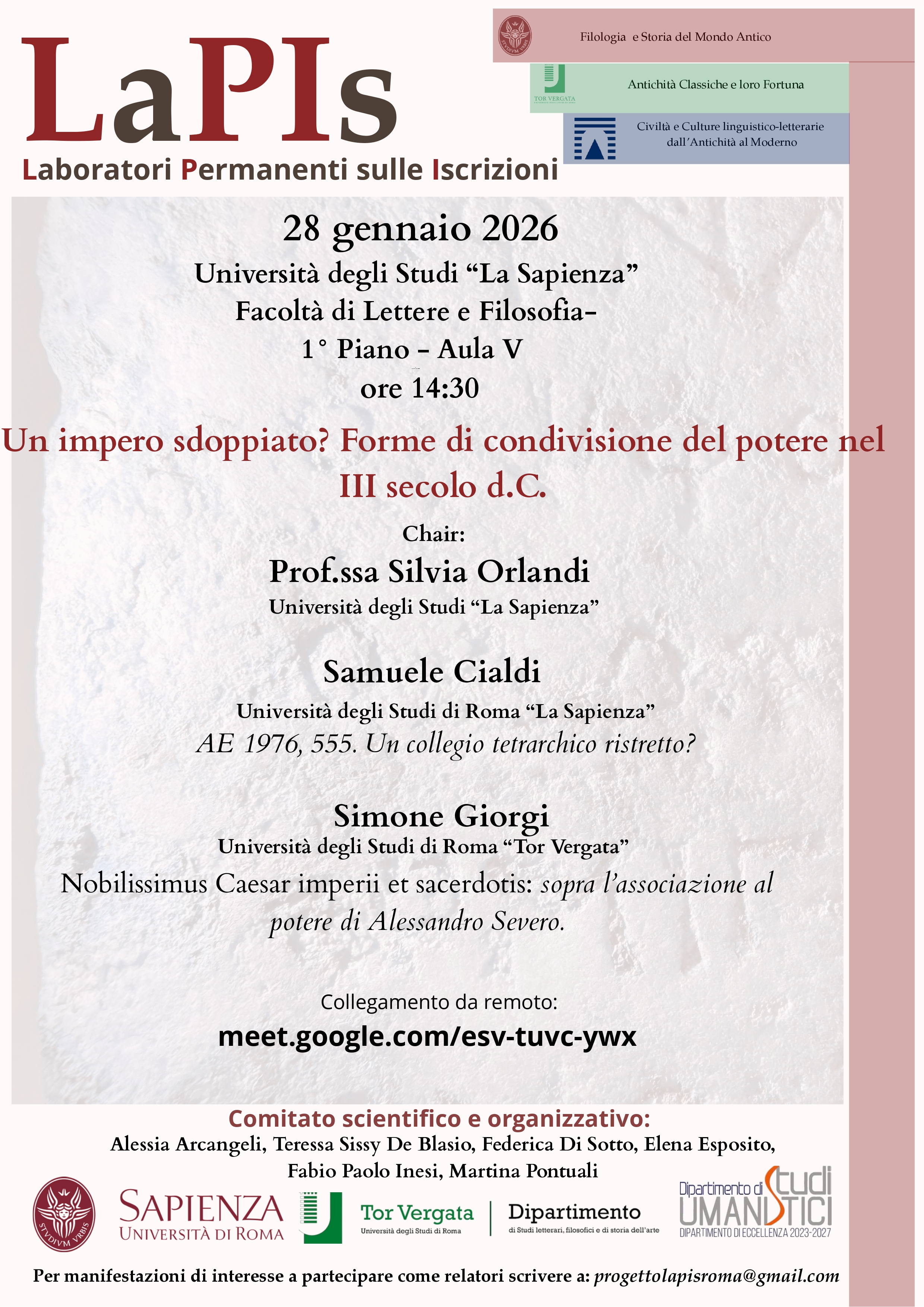 LaPIs - Laboratori Permanenti Iscrizioni (Permanent Enrolment Laboratories) is a series of inter-university doctoral seminars dedicated to Greek and Latin epigraphy, organised jointly by doctoral students from the three universities of Rome (La Sapienza, Tor Vergata, Roma Tre). The seminars take the form of paired presentations: each meeting is dedicated to a common macro-theme, to which each speaker contributes with an individual presentation. The total duration of the session is approximately one hour (30 minutes for each presentation), followed by a final discussion. A professor chairs the session.