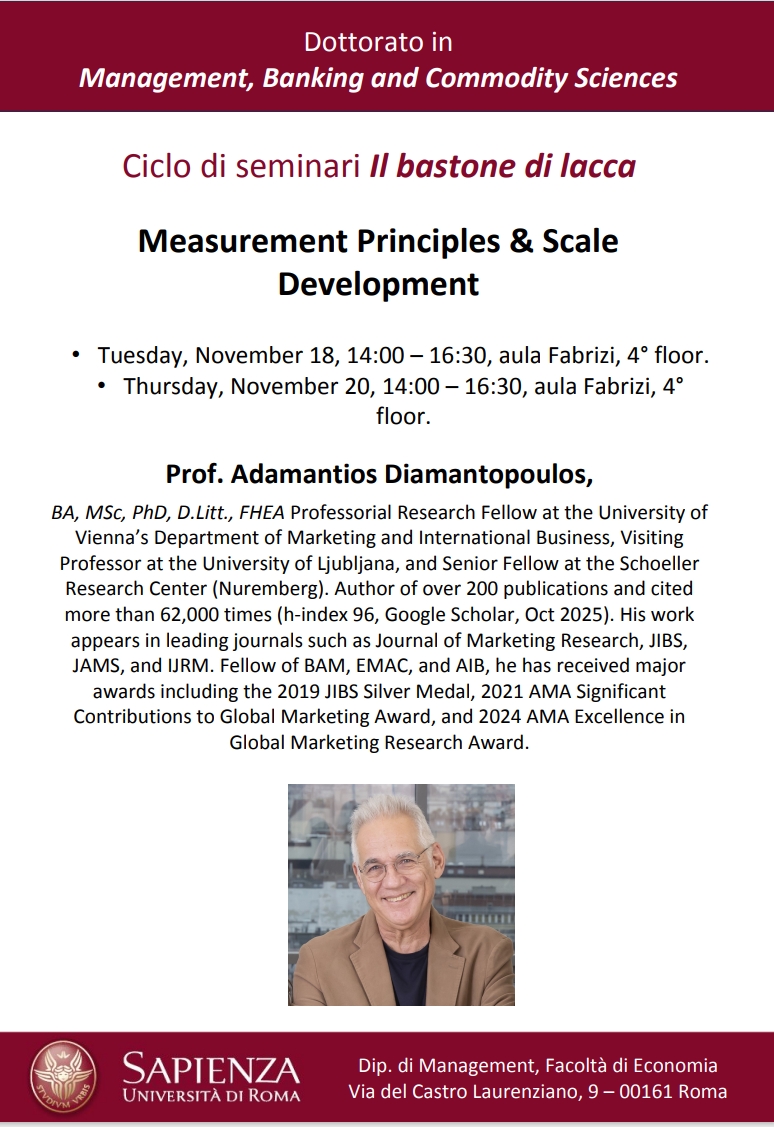 Measurement Principles & Scale Development 18 e 20 /11/2025 Measurement Principles & Scale Development Tuesday, November 18, 14:00 – 16:30, aula Fabrizi, 4° floor.Thursday, November 20, 14:00 – 16:30, aula Fabrizi, 4° floor.