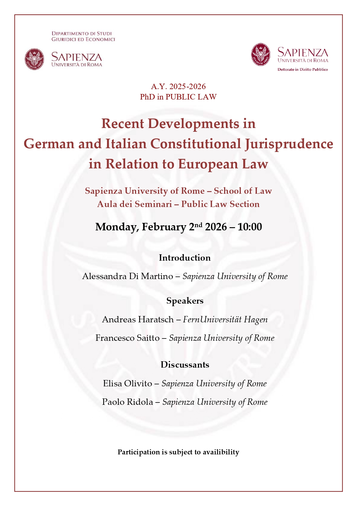 Lunedì 2 febbraio 2026, ore 10:00, Aula Calasso