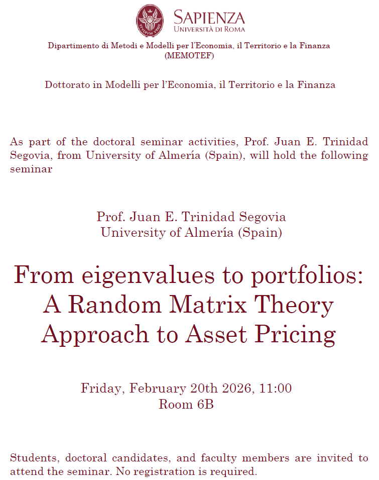 Seminar Prof. Juan E. Trinidad - February 20, 2026 February 20, 2026 Prof. Juan E. Trinidad Segovia University of Almería (Spain) From eigenvalues to portfolios: A Random Matrix Theory Approach to Asset Pricing Friday, February 20th 2026, 11:00 Room 6B