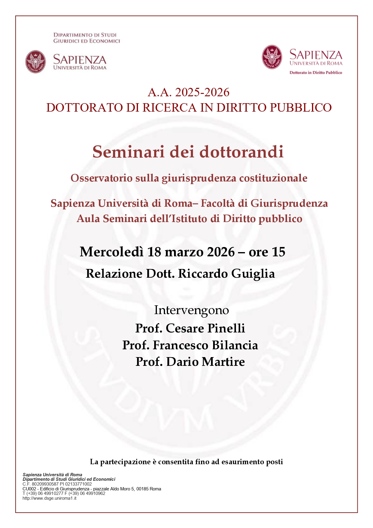 Mercoledì 18 marzo 2026, ore 17:00, Aula Seminari dell’Istituto di Diritto Pubblico