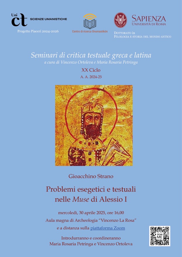 Prof. Gioacchino Strano, Università di Catania: Problemi esegetici e testuali nelle Muse di Alessio I. Sarà possibile partecipare al Seminario internazionale il giorno 30 aprile 2025 ale ore 16,00, presso l'Aula Magna di Archeologia "Vincenzo La Rosa", e online sulla piattaforma Zoom al seguente link: