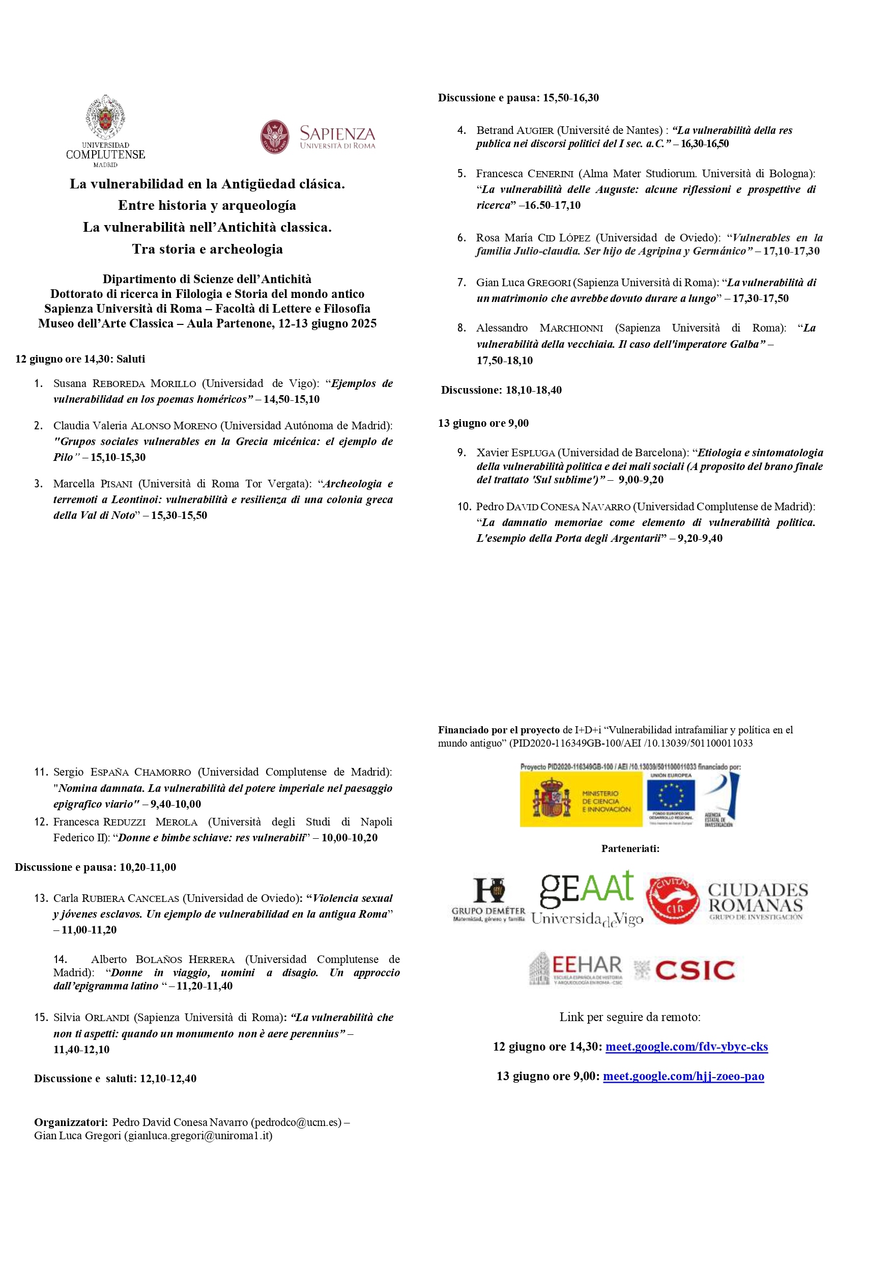 Seminario: La vulnerabilità nell’Antichità classica. Tra storia e archeologia Facoltà di Lettere e Filosofia, Museo dell’Arte Classica – Aula Partenone, 12-13 giugno 2025 Link per seguire da remoto: 12 giugno ore 14,30: meet.google.com/fdv-ybyc-cks 13 giugno ore 9,00: meet.google.com/hjj-zoeo-pao 12 giugno 2025