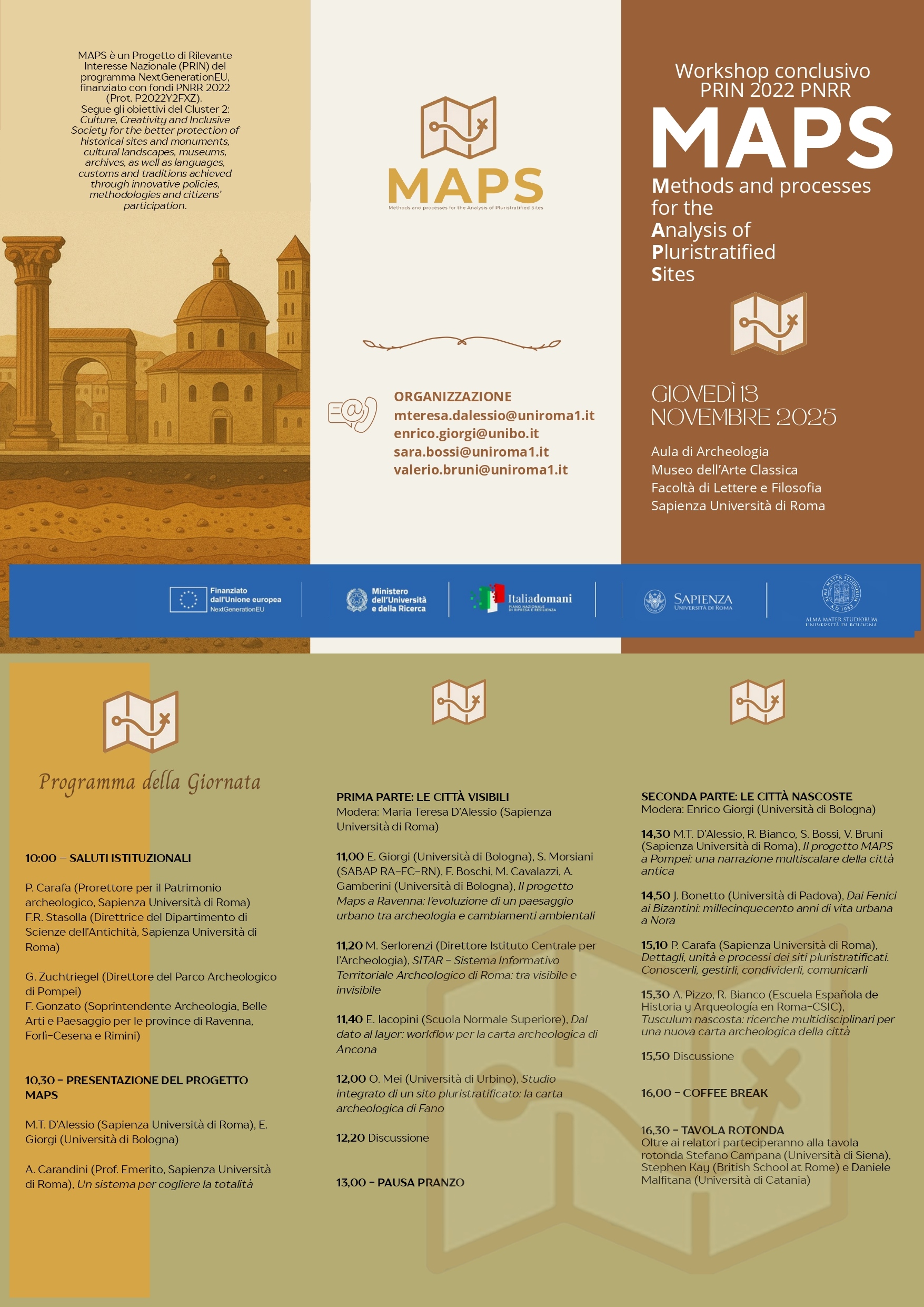 La giornata è organizzata all'interno del progetto PRIN2022PNRR intitolato MAPS - Methods and processes for the Analysis of Pluristratified Sites che vede coinvolti gli Atenei di Roma Sapienza (P.I. M.T. D'Alessio) e Bologna (Co-P.I. Enrico Giorgi).