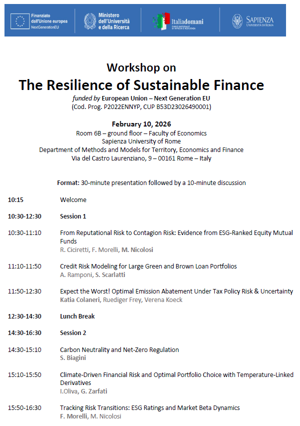 Workshop on The Resilience of Sustainable Finance - February 10, 2026 10 Febbraio 2026 February 10, 2026 Room 6B – ground floor – Faculty of Economics Sapienza University of Rome Department of Methods and Models for Territory, Economics and Finance Via del Castro Laurenziano, 9 – 00161 Rome – Italy
